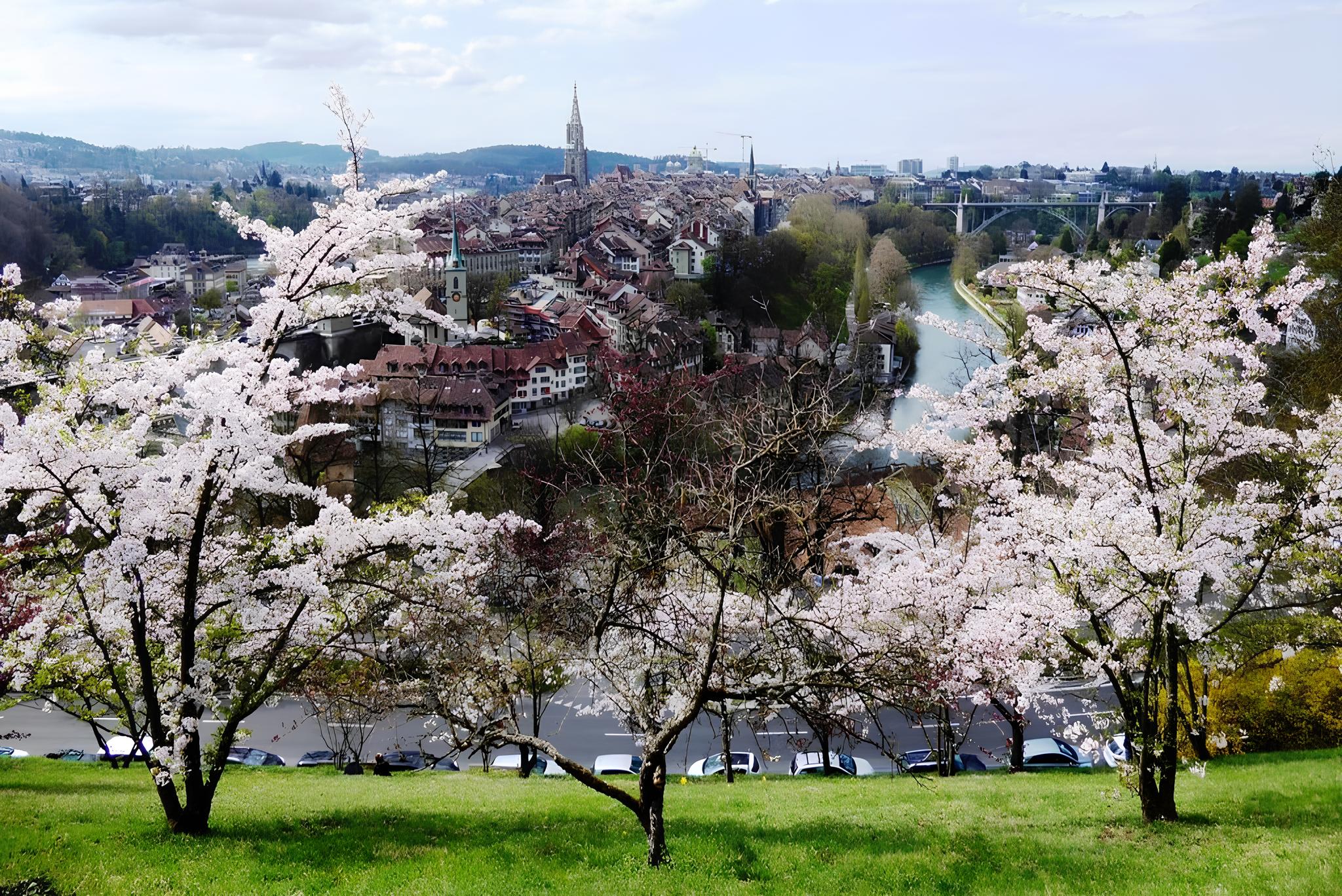 A fascinante Berna é reconhecida não apenas por seu patrimônio histórico e arquitetônico, mas também por sua forte conexão com a natureza. A cidade se destaca pela abundância de áreas verdes bem preservadas, que proporcionam qualidade de vida aos moradores e experiências inesquecíveis aos visitantes. Um dos espaços mais emblemáticos é o Rosengarten, um belíssimo parque repleto de roseiras coloridas, caminhos tranquilos e bancos estrategicamente posicionados. Dali, é possível apreciar uma vista panorâmica espetacular do Centro Histórico de Berna, com seus telhados avermelhados, torres medievais e o curso sinuoso do Rio Aare.
