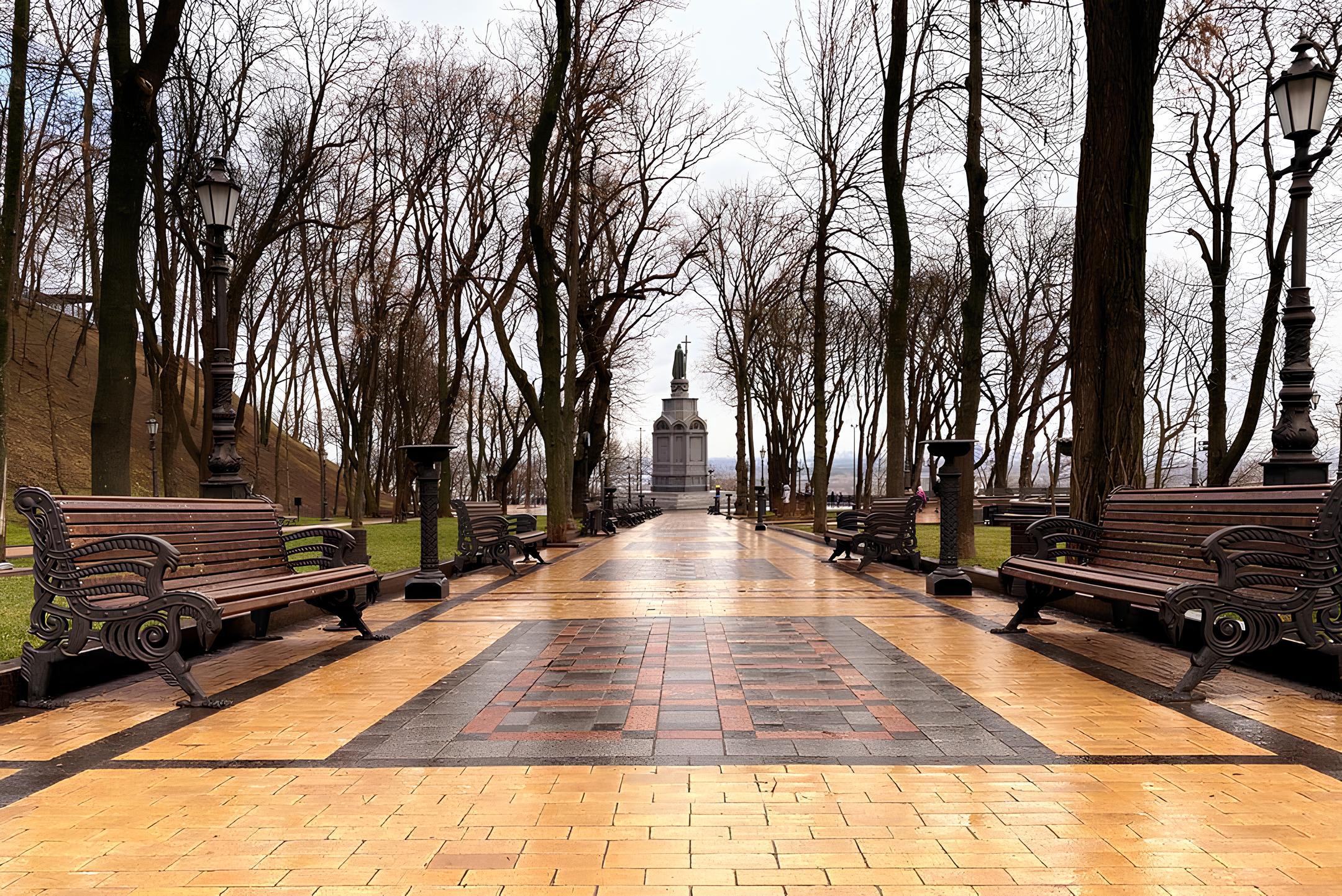 Entre os espaços mais simbólicos está o Parque Mariinsky — localizado próximo ao imponente Palácio Mariinsky, a residência cerimonial oficial do presidente da Ucrânia. O parque se caracteriza por seus caminhos sombreados, canteiros floridos e vistas privilegiadas do Rio Dniepre — um dos principais cursos d’água da região. É um local ideal para caminhadas tranquilas, momentos de descanso e contemplação da cidade a partir de seus mirantes naturais.